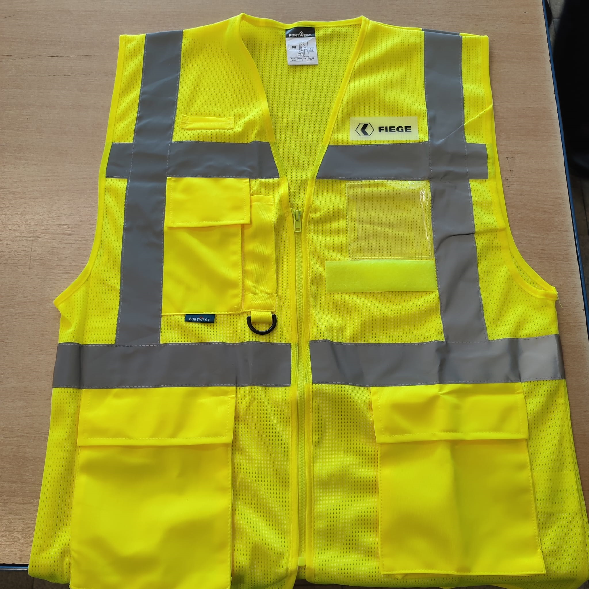 Mesh Warnweste, warngelb Logo *FIEGE*,1fbg-schwarz, Schulterreflex + Ausweistasche und Flauschband