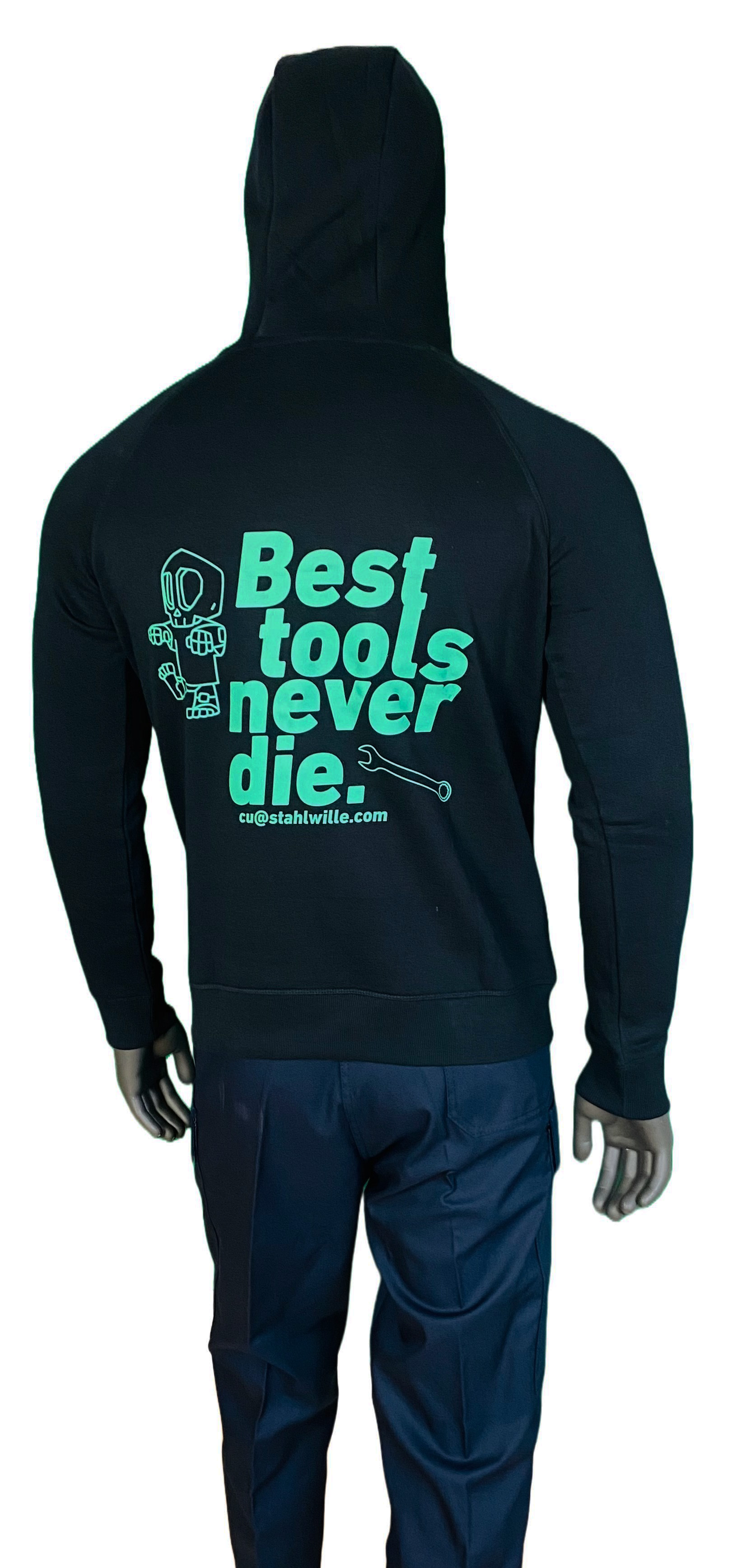 und Logo >best tools never die< in grün auf den Rücken
