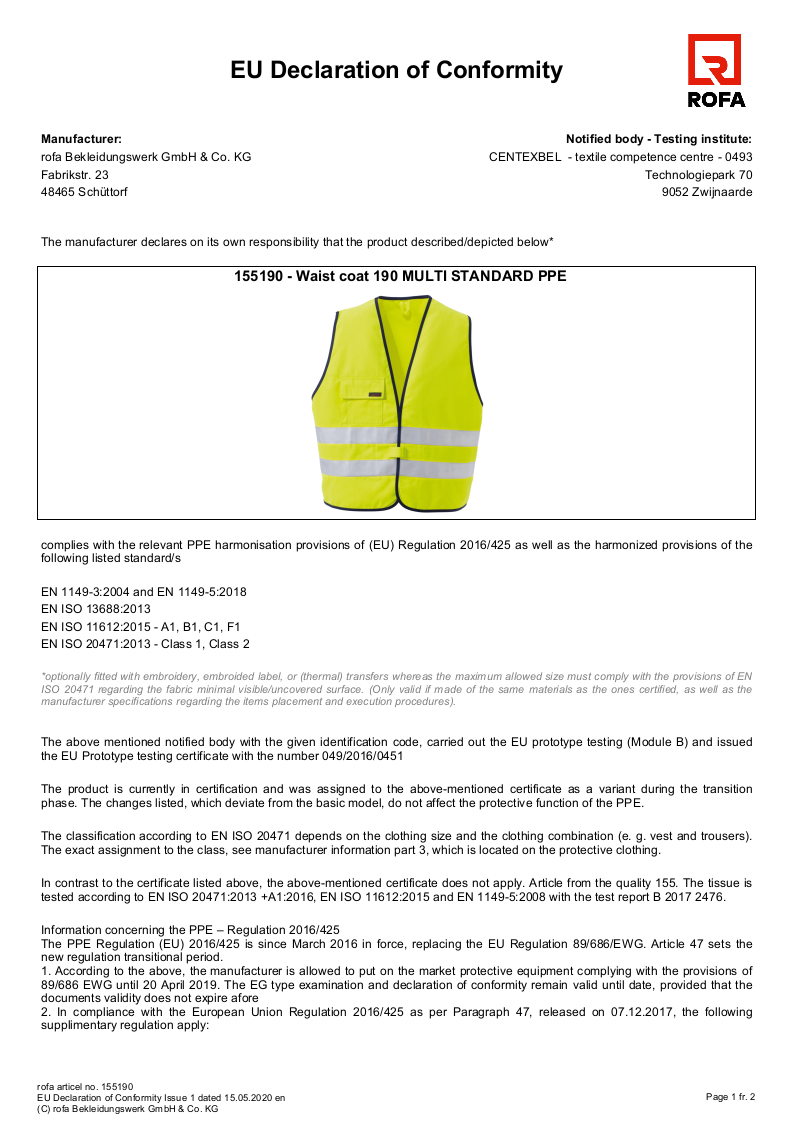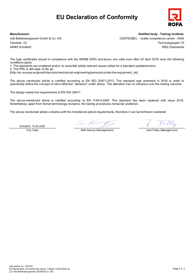 EN1149, EN ISO 11612, 20471 Kl 1 (Kl 2 ab Gr. II)